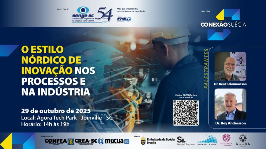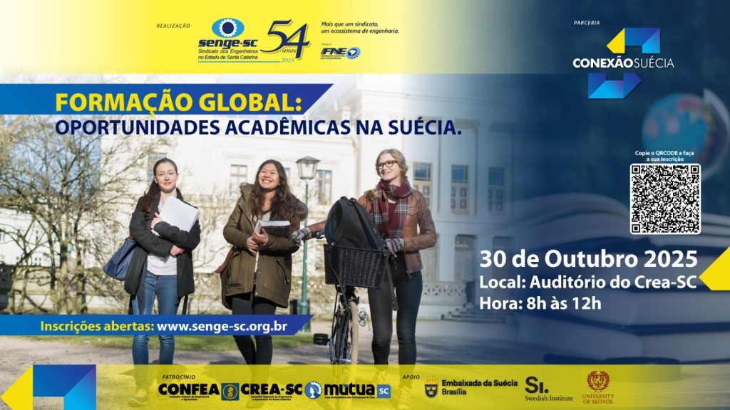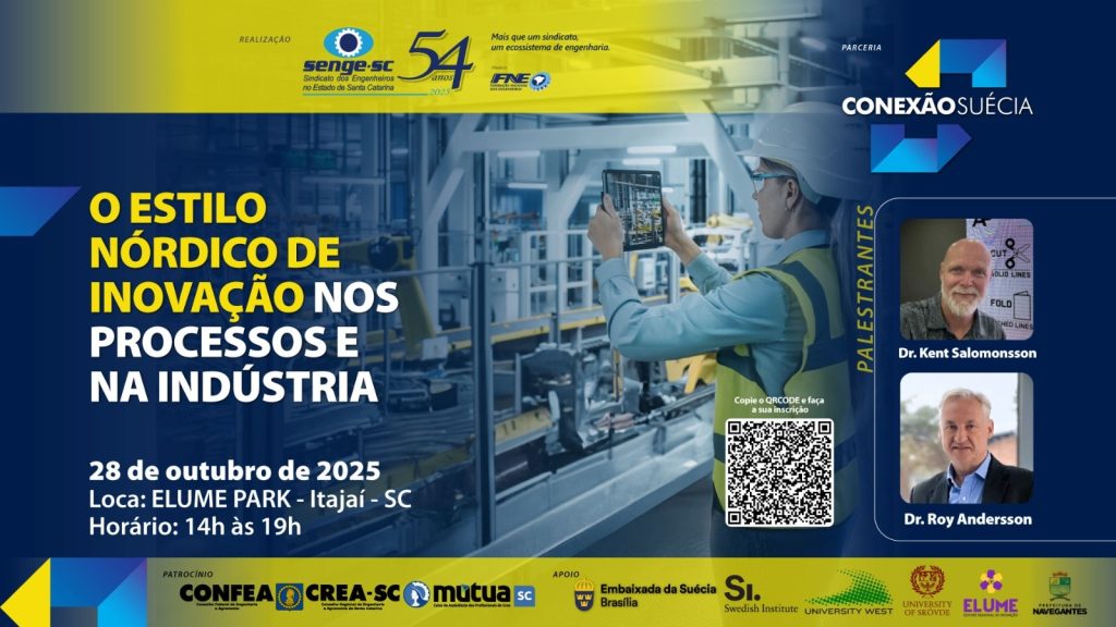 O Sindicato dos Engenheiros no Estado de Santa Catarina (Senge-SC) promove, entre os dias 28 e 30 de outubro de 2025, a Semana Conexão Suécia, uma iniciativa que celebra os 10 anos da parceria entre instituições catarinenses e suecas.